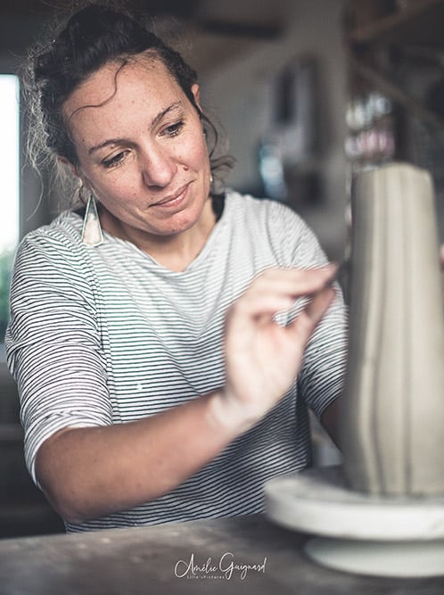 j’ai décidé de prendre cette envie vraiment au sérieux. À ce moment-là, mes conditions de vie me l’ont permis : un nouveau boulot moins chronophage, une maison à la campagne et quelques économies.  J’avais les bases de cours de poterie, de quelques stages menés sans régularité mais avec enthousiasme. J’avais envie de passer ce cap où je me sentais frustrée de ne pouvoir tourner plus. Forcément, quand on n’a pas de matériel à la maison, difficile d’assouvir notre envie de poterie. J’ai donc investi dans un tour de potier, puis dans un four et je me suis obligée à travailler régulièrement la terre, à suivre de nombreux stages, puis à passer le CAP.