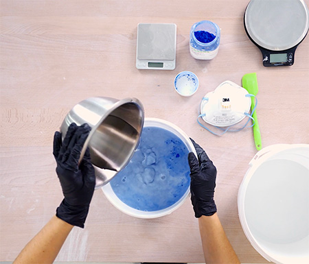 Pour la colorer, tu ajoutes des colorants de masse ou des oxydes métalliques directement dans la terre de coulage. Une fois cette terre colorée, tu pourras l’utiliser de différentes manières dans ton moule de coulage. Tu pourra l’utiliser en marbré, en applat de couleur ou en vague de motifs.