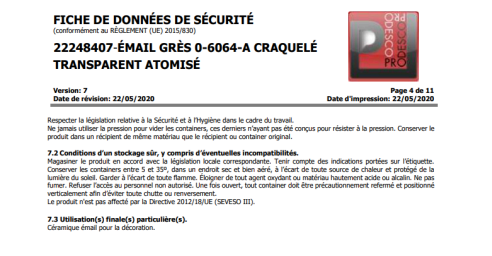 - L’émail céramique prêt à l’emploi est testé. En cas de contrôle inopiné, les céramistes pro peuvent justifier de la conformité de leur émail et donc de leur poterie. Cela ne veut pas toujours dire que cet émail est alimentaire, en tout cas, il est conforme à la loi.