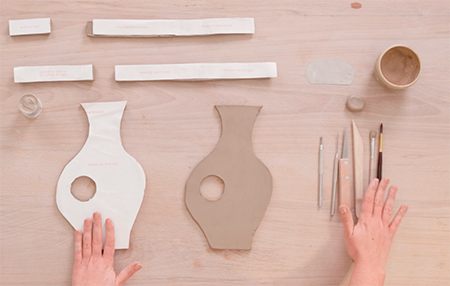 Le principe est de réaliser des plaques à l’aide d’un rouleau et de tasseaux d’épaisseur déterminée. La régularité de l’épaisseur est primordiale. On découpe ensuite des éléments dans ces plaques que l’ont va mettre en forme et assembler.