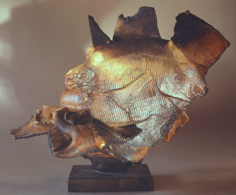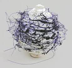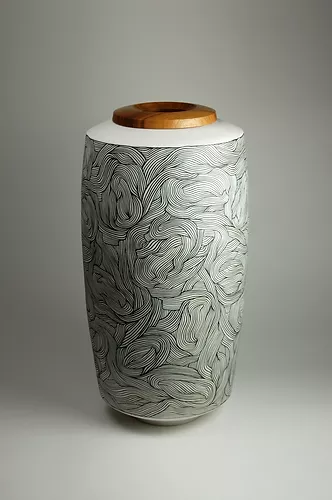 Une extension du Raku occidental dans laquelle nous exploitons un défaut. C’est David Roberts qui a découvert cette voie lors d’une cuisson où l’engobe n’a pas tenu sur la pièce. Le principe est de partir d’une surface soignée et polie sur terre crue. Il faut faire une première cuisson de biscuit. Il faut ensuite passer un engobe réfractaire sur la pièce qui est préparé pour tenir le temps de la cuisson. On pose ensuite un émail par-dessus. La cuisson se passe comme pour le Raku occidental. Une fois la cuisson réalisée, on épluche l’engobe qui part avec l’émail. On obtient alors des variations de couleur entre les parties qui auront été émaillées ou pas. L’ émail agit comme un cache, et permet de garder des parties blanches. Cela crée un contraste avec les parties noires de la terre non protégée.