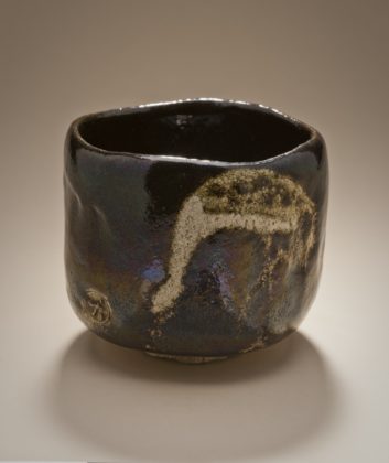 C’est le Raku évoqué plus haut. Plus qu’une technique de cuisson, c’est une philosophie où la simplicité, l’irrégularité et le naturel sont fondamentaux. La pièce est cuite, puis plongée dans de l’eau pour limiter l’apport d’oxygène, arrêter la combustion, ce qui va engendrer ce réseau de craquelures.