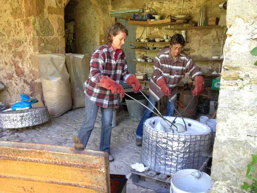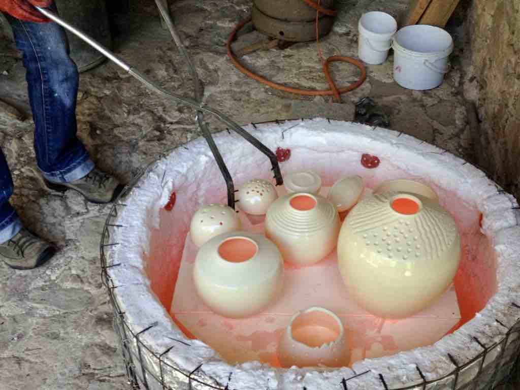 La cuisson est rapide et basse température. On sort les pièces alors que le four est incandescent à l’aide de pinces.