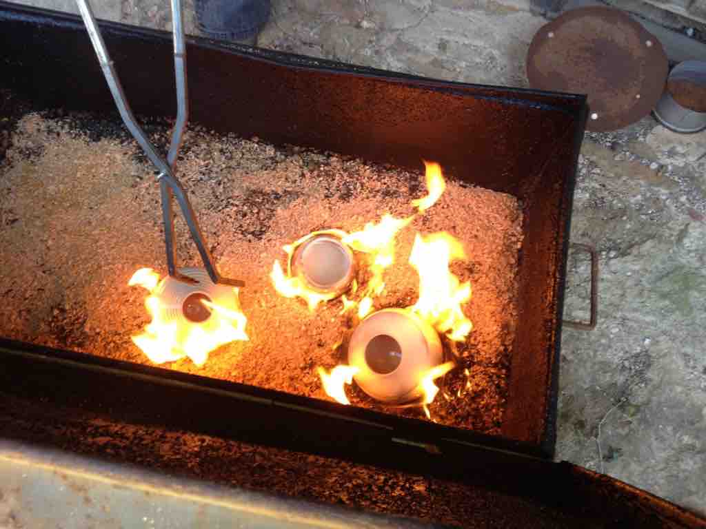 La dernière étape est de récupérer les pièces alors que le four est encore chaud pour plonger les pièces dans des combustibles.L’apport d’oxygène est alors limité. Cette phase est la réaction d’oxydoréduction au cours de laquelle apparaissent les couleurs plus ou moins métallisées, les craquelures ainsi que l’effet d’enfumage. Ainsi, si tu laisses ta pièces quelques minutes à l’air ou si tu la mets directement dans un combustible, les couleurs varieront.