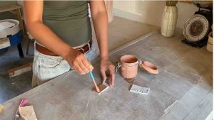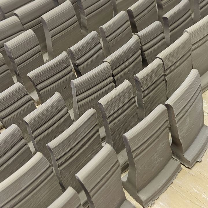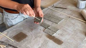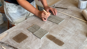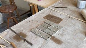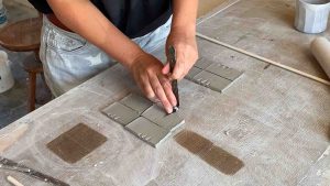 Je te conseille de préparer plusieurs tuiles d’un coup car tu les utiliseras tout au long de ta pratique. Stocke-les dans un coin et sors-les à chaque fois que tu en as le besoin. Pour l’engobe, ne stocke pas les tuiles. Fais-les au fur et à mesure, car les pièces à consistance cuir sec se cassent facilement.
