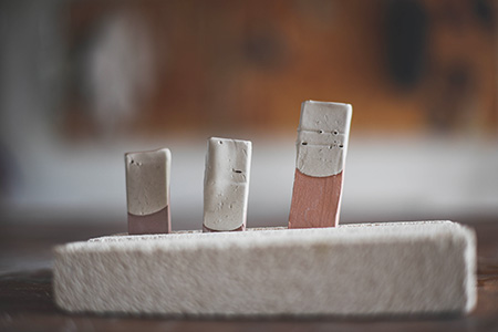 Avant de placer ta tuile dans le four, désémaille la partie en contact avec le support et la plaque de cuisson. Place la tuile verticalement afin d’analyser le comportement de l’émail lors de la cuisson. Tu verras ainsi si l’émail a tendance à couler ou pas. Petite astuce, place la tuile à l’envers, la tête en bas, afin que l’émail ai une zone tampon où couler !