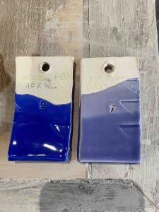 J’aime noter les proportions testées sur ma tuile. Tu peux les noter au crayon à oxyde si c’est avant la cuisson, ou au crayon simple si c’est après. Ici, j’ai testé un même émail avec des proportions différentes : 10% à gauche et 2% à droite. On constate qu’en augmentant le pourcentage de colorant, la couleur devient plus vive et l’émail plus opaque. Pense bien à vérifier la densité de tes émaux cela impacte énormément le rendu.